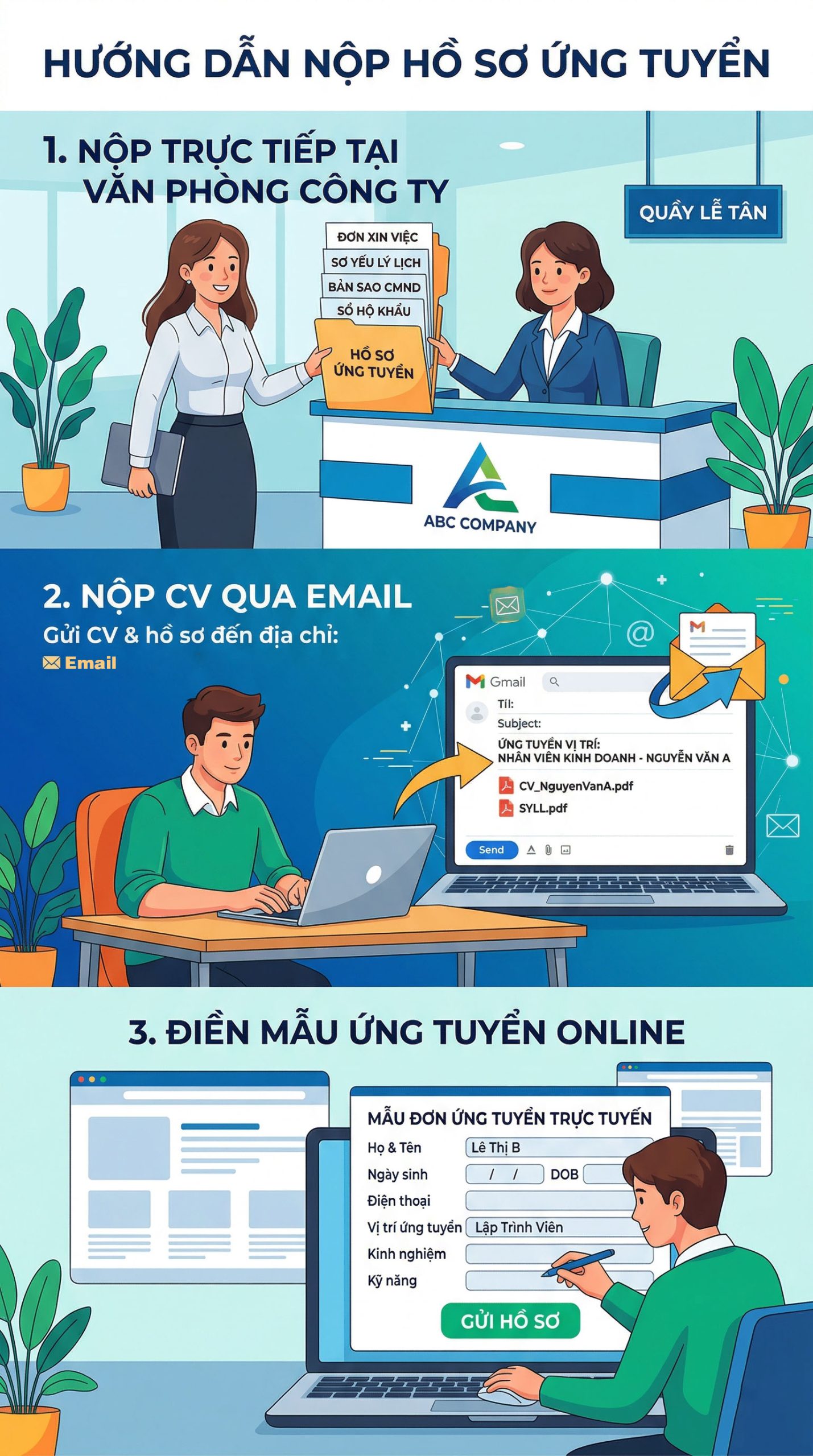 📄 Nộp trực tiếp hồ sơ tại văn phòng công ty. Hồ sơ bao gồm: Đơn xin việc, Sơ yếu lý lịch, bản sao CMND, bản sao Sổ hộ khẩu.